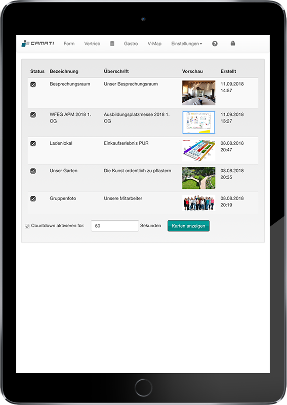 Touchanwendungen leicht gemacht. Bild hochladen, Touchzonen mit der Maus einzeichnen und Kunden oder Gästen zur verfügung stellen. Ob virtueller Wegweiser oder Informationstafel, mit Camati V-Maps füllen Sie ganz einfach jeden Touchscreen mit Inhalten.